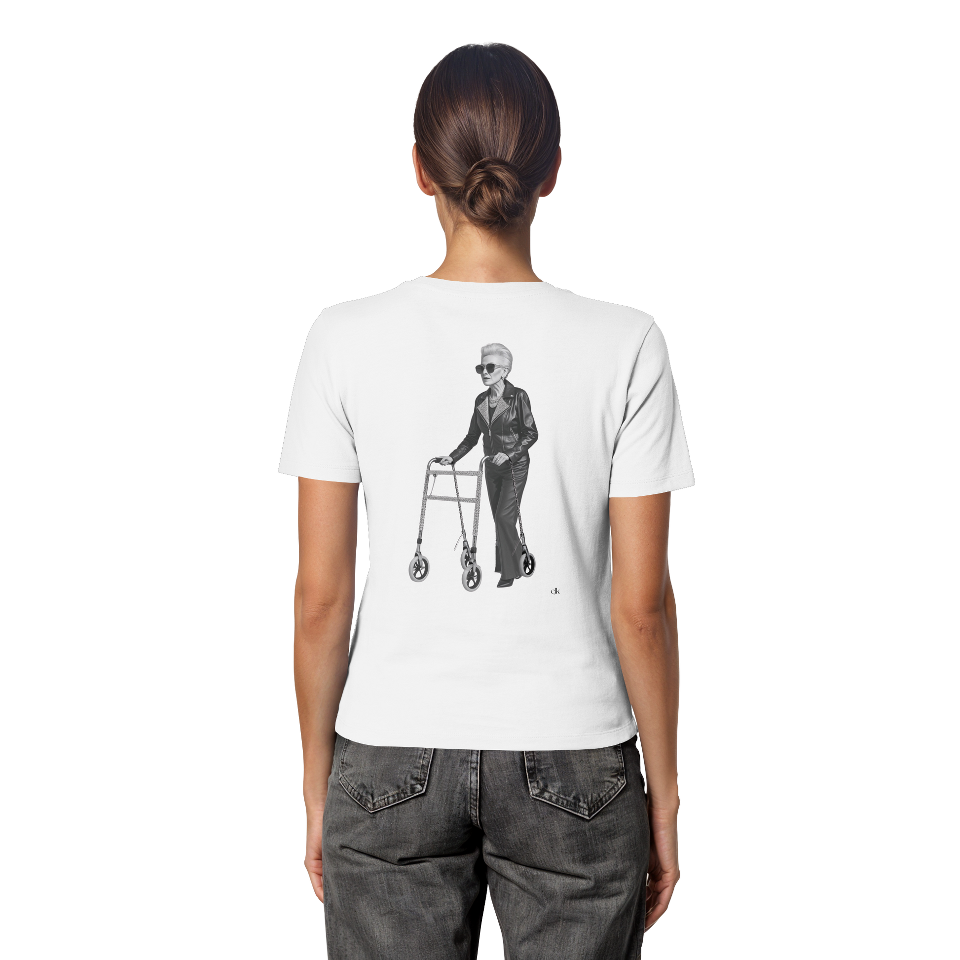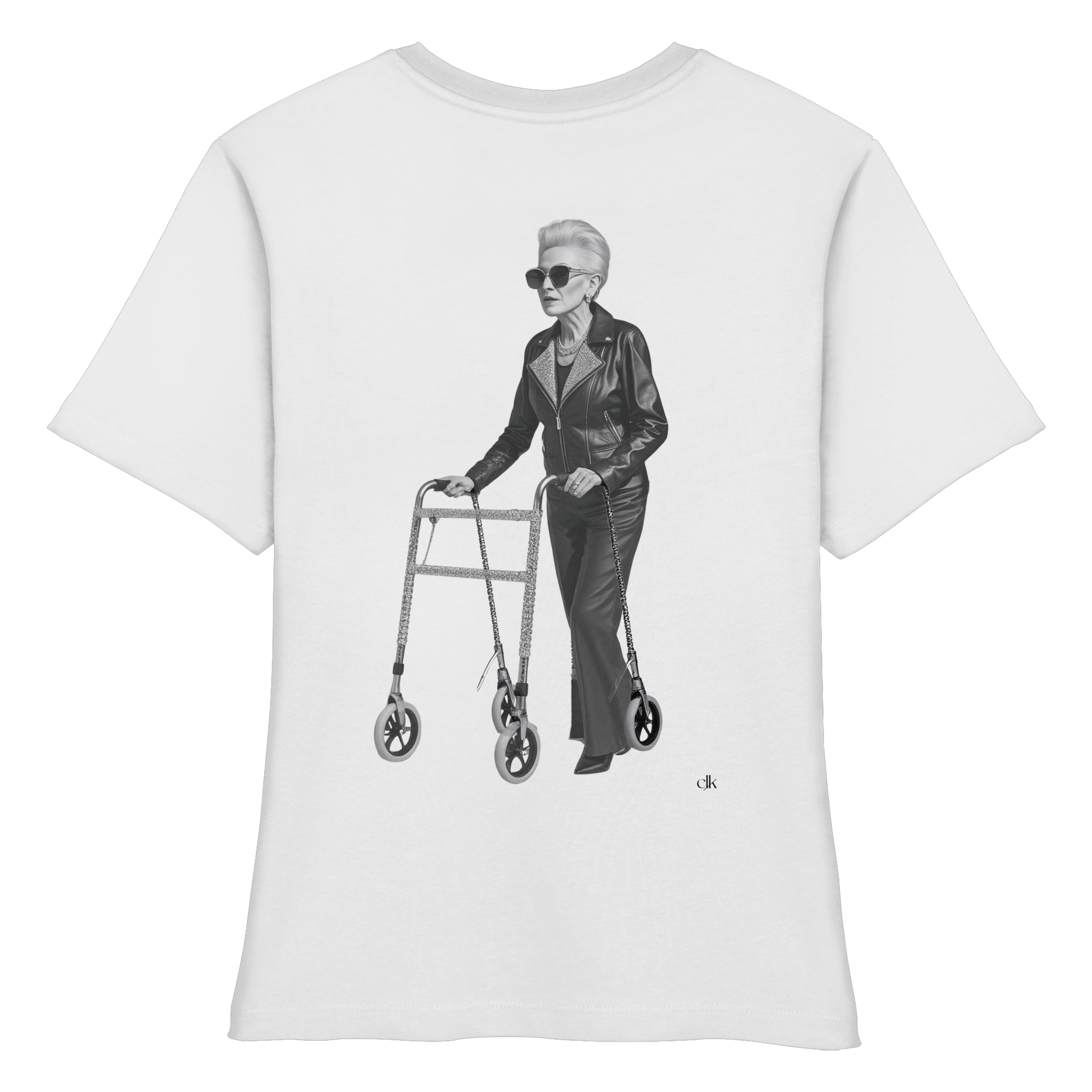 Rockige Grande Dame mit Lederjacke und glitzerndem Gehwagen - rebellisch, glamourös, furchtlos.